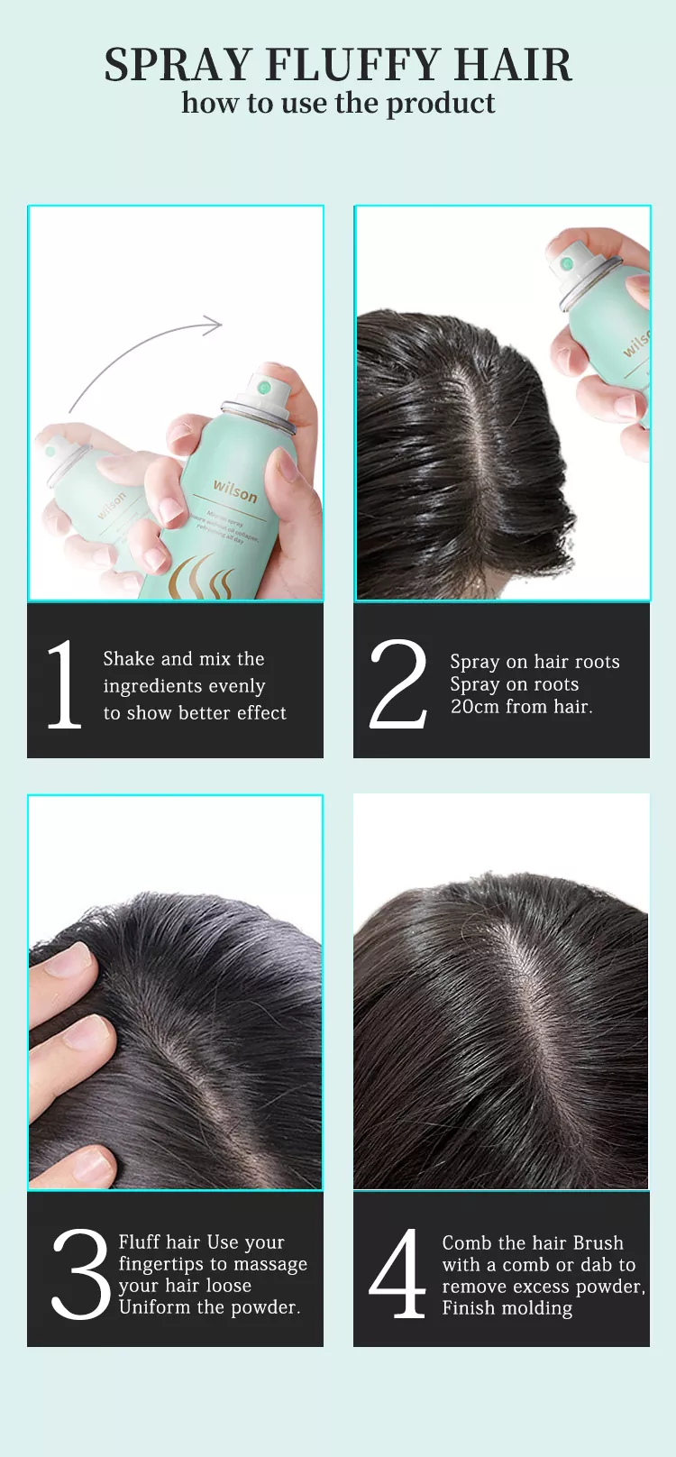 Wilson Instant non-lava frigus siccum shampoo imbre commodum est capillus purgatorius, qui capillos facile purgat cum shampoo non vacat, refrigerium et suavem odorem liberans. Shampoo aquam non requirit et facile uti. Simpliciter rores in radices comarum tuorum, leniter suspense et linteo mundo absterge, ut non solum uncto et odore removeatur, sed etiam volumen comarum tuarum augeat.